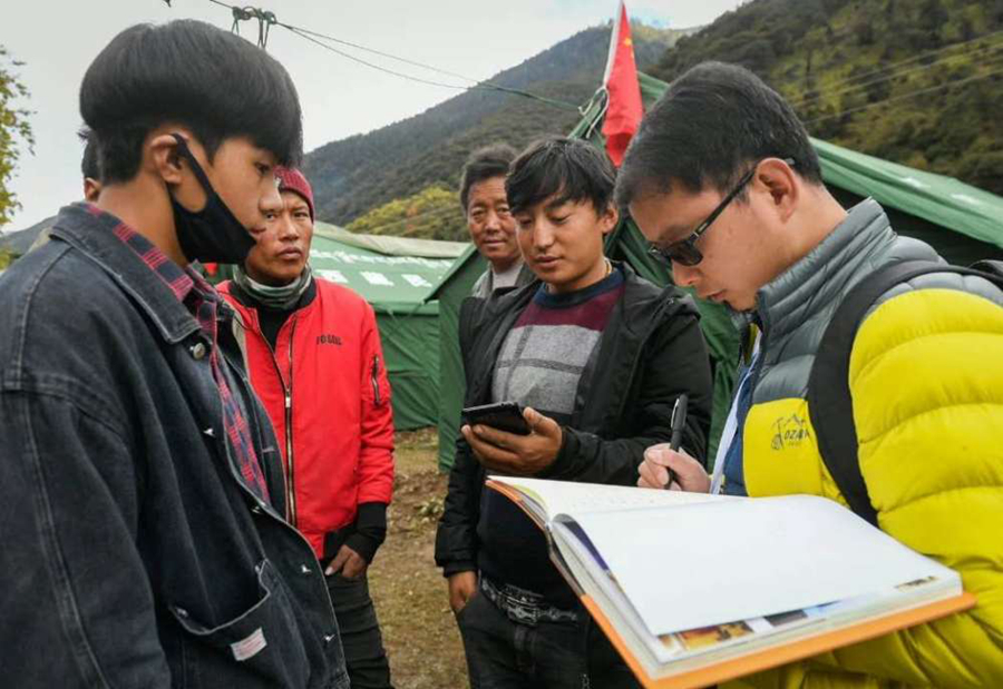 2018年10月14日,西藏分社记者张京品(右一)在昌都市江达县波罗乡金沙江堰塞湖安置点采访受灾群众。(新华社记者刘东君 摄)