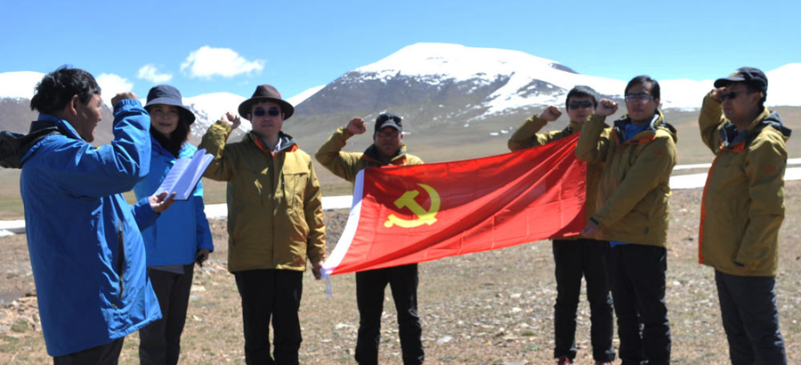 2017年6月26日,西藏分社分党组书记、社长段芝璞(左三)带领科考报道组党员索朗罗布、吕诺、罗布次仁、李成颖、黄波涛、薛文献(从左至右),在海拔5200多米的唐古拉山上重温入党誓词。(昂翁彭措 摄)