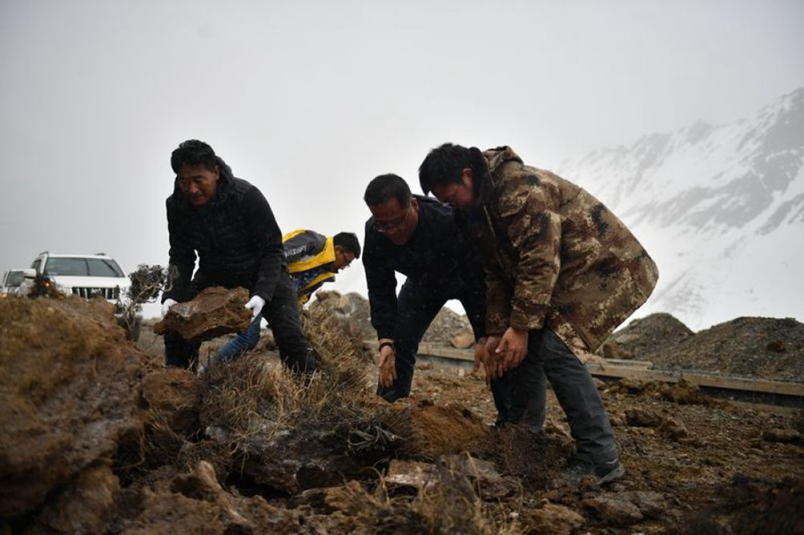2019年4月7日,西藏分社记者张宸(右一)与同事在前往边境乡玉麦采访途中遭遇塌方,大家下车清理路上的滚石、泥土。(新华社记者晋美多吉 摄)