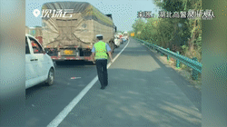 在湖北,一名交警停车拾起掉落在高速公路上的国旗。