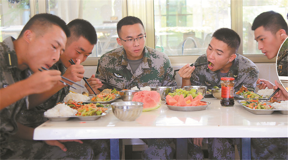 新兵:可不是?现在营区食堂“六菜一汤”是标配,鸡蛋、牛奶、水果天天见。妈妈再也不用担心我会吃不好,就是我担心自己的体重往上涨……