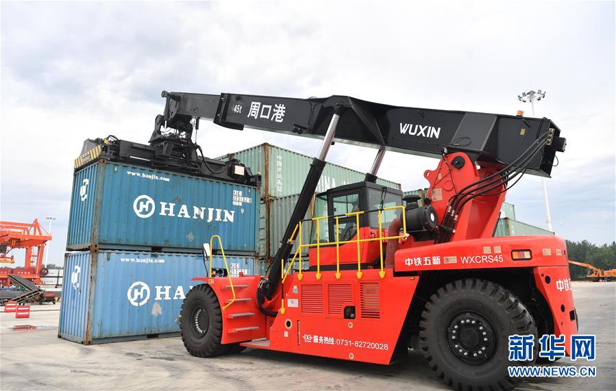 工人在周口中心港码头搬运集装箱(7月31日摄)。 新华社记者 李嘉南 摄