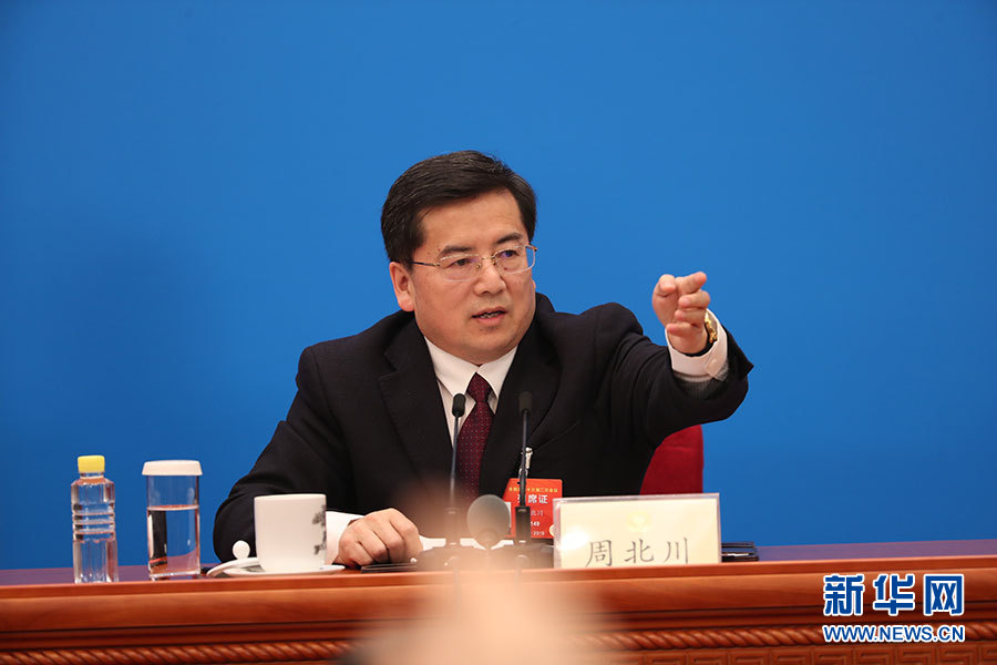 全国政协十三届二次会议新闻发布会于3月2日15:00在人民大会堂一层新闻发布厅召开,大会新闻发言人郭卫民向中外媒体介绍本次大会有关情况并回答记者提问。图为新闻发布会主持人周北川。新华网/中国政府网 陈杰 摄