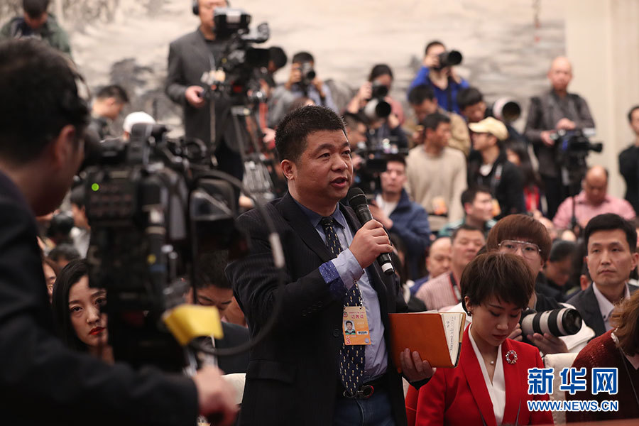 全国政协十三届二次会议新闻发布会于3月2日15:00在人民大会堂一层新闻发布厅召开,大会新闻发言人郭卫民向中外媒体介绍本次大会有关情况并回答记者提问。图为新民晚报记者提问。 新华网/中国政府网 马娟 摄
