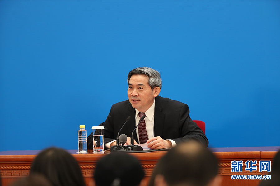 十三届全国人大二次会议3月4日上午11时15分在人民大会堂新闻发布厅举行新闻发布会,由大会发言人张业遂就大会议程和人大工作相关的问题回答中外记者提问。图为新闻发布会主持人何绍仁。新华网/中国政府网 陈杰 摄