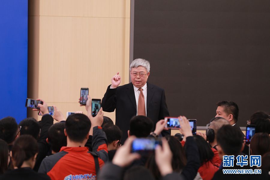 十三届全国人大二次会议新闻中心于3月7日10时50分在梅地亚中心新闻发布厅举行记者会,邀请国务院扶贫开发领导小组办公室主任刘永富就“攻坚克难——坚决打赢脱贫攻坚战”相关问题回答中外记者提问。图为记者会结束后刘永富与记者们交流。新华网 刘厦 摄