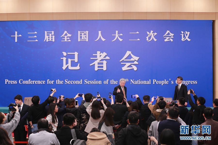 十三届全国人大二次会议新闻中心于3月7日10时50分在梅地亚中心新闻发布厅举行记者会,邀请国务院扶贫开发领导小组办公室主任刘永富就“攻坚克难——坚决打赢脱贫攻坚战”相关问题回答中外记者提问。图为记者会结束后刘永富与记者们交流。新华网 刘厦 摄
