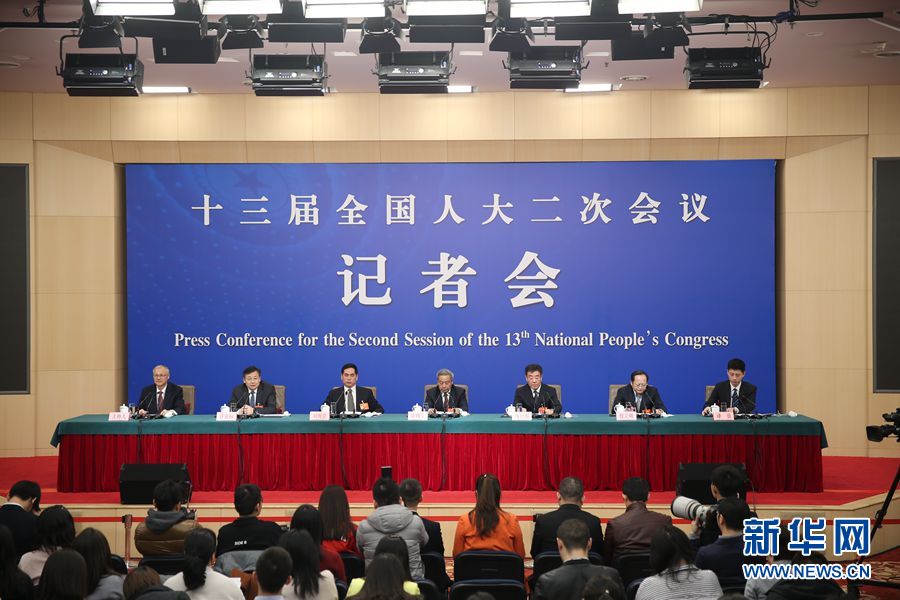 十三届全国人大二次会议新闻中心3月9日在梅地亚中心新闻发布厅举行记者会,邀请全国人大农业与农村委员会主任委员陈锡文、全国人大财政经济委员会副主任委员乌日图、全国人大常委会法制工作委员会副主任刘俊臣、全国人大常委会法制工作委员会副主任许安标、全国人大环境与资源保护委员会委员程立峰就“人大立法工作”相关问题回答记者提问。图为记者会现场。新华网/中国政府网 刘厦 摄