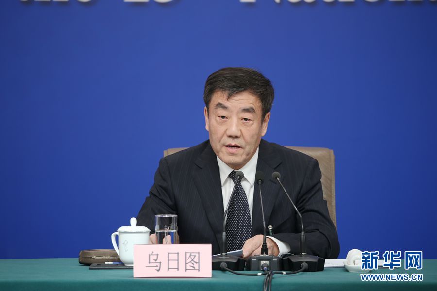 十三届全国人大二次会议新闻中心3月9日在梅地亚中心新闻发布厅举行记者会,邀请全国人大农业与农村委员会主任委员陈锡文、全国人大财政经济委员会副主任委员乌日图、全国人大常委会法制工作委员会副主任刘俊臣、全国人大常委会法制工作委员会副主任许安标、全国人大环境与资源保护委员会委员程立峰就“人大立法工作”相关问题回答记者提问。图为全国人大财政经济委员会副主任委员乌日图。新华网/中国政府网 刘厦 摄