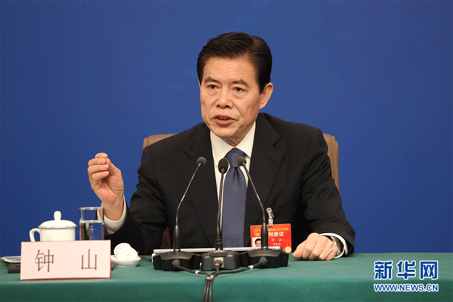 十三届全国人大二次会议新闻中心3月9日(星期六)10时30分在梅地亚中心新闻发布厅举行记者会,邀请商务部部长钟山、副部长兼国际贸易谈判副代表王受文、副部长钱克明就“促进形成强大国内市场 推动全方位对外开放”相关问题回答中外记者提问。图为商务部部长钟山。新华网/中国政府网 陈杰 摄