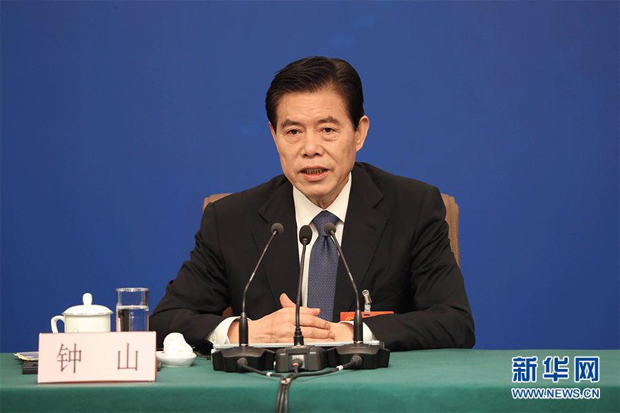 十三届全国人大二次会议新闻中心3月9日(星期六)10时30分在梅地亚中心新闻发布厅举行记者会,邀请商务部部长钟山、副部长兼国际贸易谈判副代表王受文、副部长钱克明就“促进形成强大国内市场 推动全方位对外开放”相关问题回答中外记者提问。图为商务部部长钟山。新华网/中国政府网 陈杰 摄
