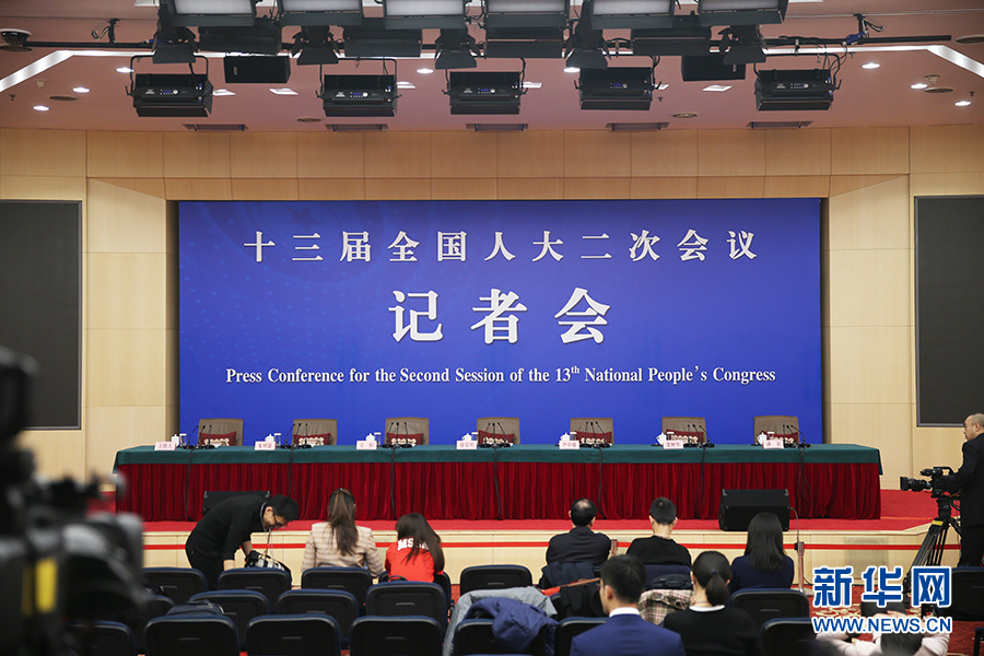 十三届全国人大二次会议新闻中心于3月10日(星期日)15时在梅地亚中心新闻发布厅举行记者会,邀请全国人大监察和司法委员会副主任委员徐显明、全国人大财政经济委员会副主任委员尹中卿、全国人大教育科学文化卫生委员会副主任委员吴恒、全国人大环境与资源保护委员会副主任委员窦树华和全国人大常委会预算工作委员会副主任朱明春就“人大监督工作”相关问题回答中外记者提问。图为记者会现场。新华网/中国政府网 刘厦 摄