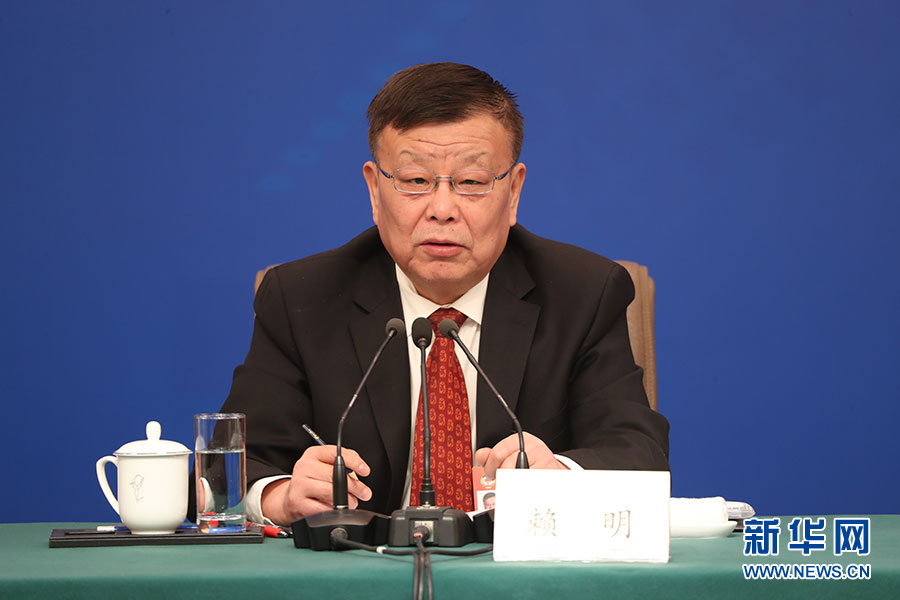 全国政协十三届二次会议3月10日(星期日)上午8:45在梅地亚两会新闻中心举行记者会,邀请5位政协委员就“新时代政协履职”回答记者提问。新华网、中国政府网进行现场直播。图为全国政协常委、副秘书长(兼)、提案委员会副主任,九三学社中央副主席赖明。新华网/中国政府网 陈杰摄
