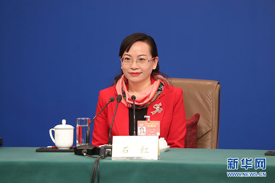 全国政协十三届二次会议3月10日(星期日)上午8:45在梅地亚两会新闻中心举行记者会,邀请5位政协委员就“新时代政协履职”回答记者提问。新华网、中国政府网进行现场直播。图为全国政协委员、湖南省湘西土家族苗族自治州政协副主席石红。新华网/中国政府网 陈杰摄