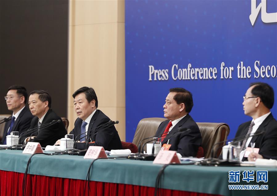 3月10日,十三届全国人大二次会议新闻中心举行记者会,邀请全国人大监察和司法委员会副主任委员徐显明、全国人大财政经济委员会副主任委员尹中卿、全国人大教育科学文化卫生委员会副主任委员吴恒、全国人大环境与资源保护委员会副主任委员窦树华和全国人大常委会预算工作委员会副主任朱明春就“人大监督工作”相关问题回答中外记者提问。这是徐显明(中)在回答记者提问。 新华社记者 沈伯韩 摄