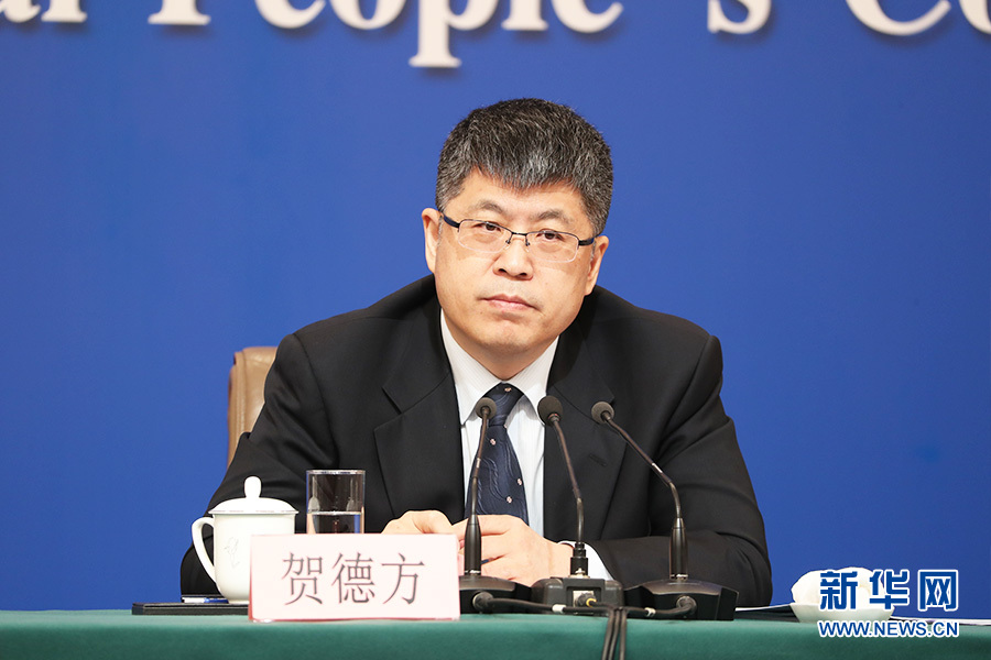 十三届全国人大二次会议新闻中心3月11日(星期一)8时45分在梅地亚中心新闻发布厅举行记者会,邀请科技部部长王志刚、副部长李萌、战略规划司司长许倞、政策法规与创新体系建设司司长贺德方、资源配置与管理司司长张晓原就“加快建设创新型国家”相关问题回答中外记者提问。图为政策法规与创新体系建设司司长贺德方。新华网/中国政府网 陈杰 摄