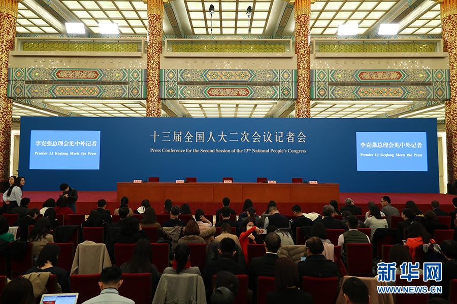 3月15日上午十三届全国人大二次会议闭幕后,国务院总理李克强在人民大会堂三楼金色大厅会见采访十三届全国人大二次会议的中外记者并回答记者提出的问题。图为记者会现场。