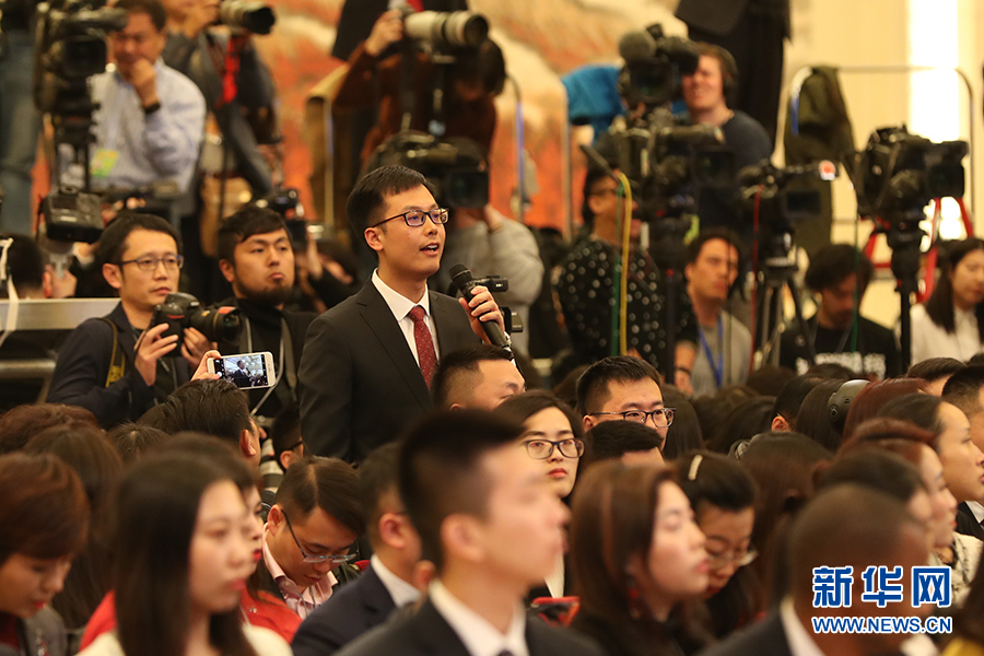 3月15日上午十三届全国人大二次会议闭幕后,国务院总理李克强在人民大会堂三楼金色大厅会见采访十三届全国人大二次会议的中外记者并回答记者提出的问题。图为新华社记者提问。新华网/中国政府网 陈杰 摄