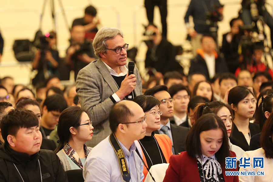 3月15日上午十三届全国人大二次会议闭幕后,国务院总理李克强在人民大会堂三楼金色大厅会见采访十三届全国人大二次会议的中外记者并回答记者提出的问题。图为西班牙记者提问。新华网/中国政府网 陈杰 摄