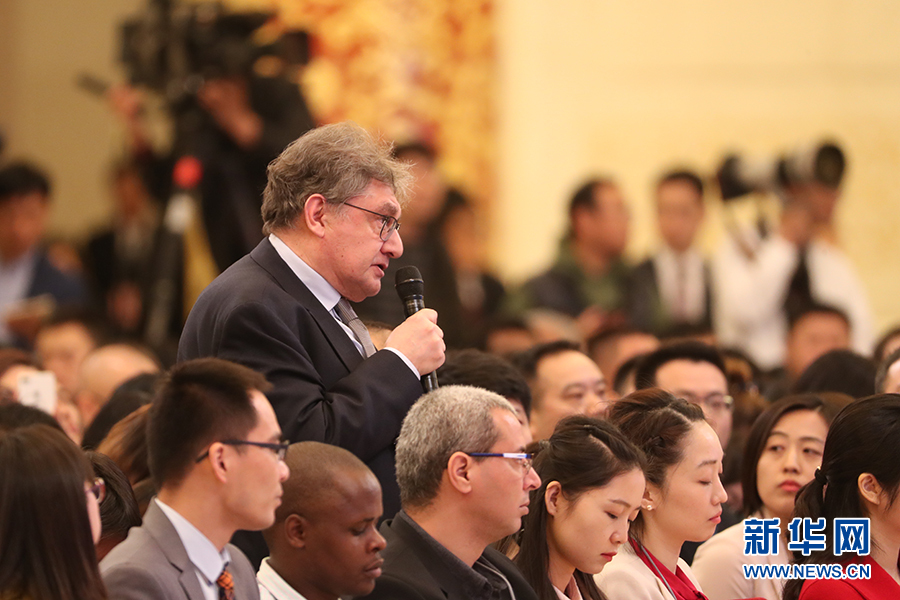 3月15日上午十三届全国人大二次会议闭幕后,国务院总理李克强在人民大会堂三楼金色大厅会见采访十三届全国人大二次会议的中外记者并回答记者提出的问题。图为塔斯社记者提问。新华网/中国政府网 刘厦 摄