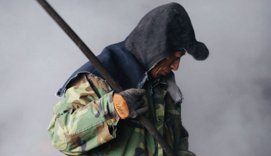 2019年12月27日,供热工人正拿起近2米长、10多斤重的铁钎进行上煤作业。新华社记者孙晓宇 摄