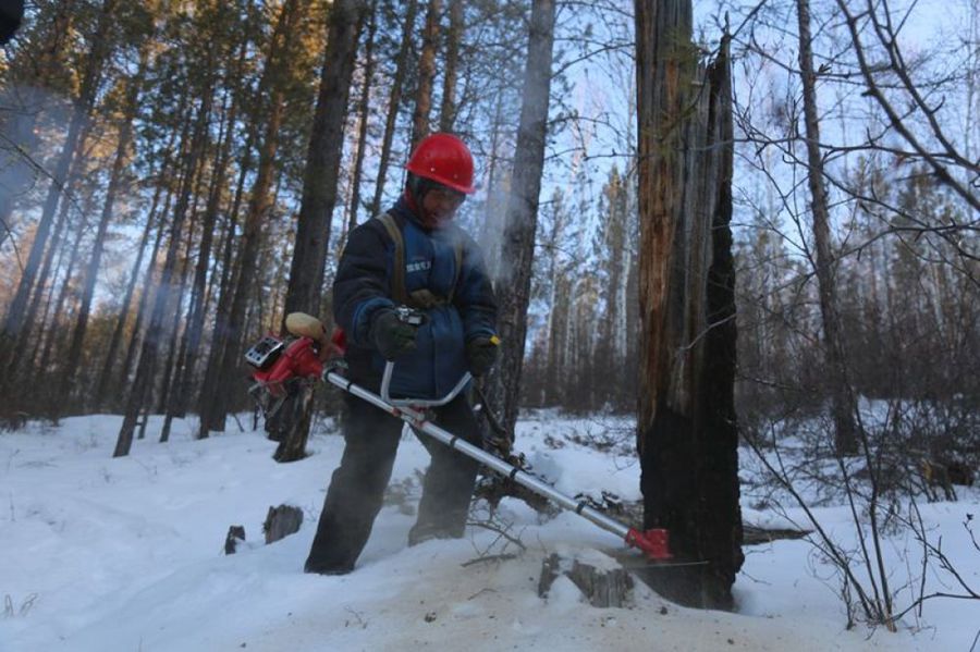 因天气过于寒冷,工人薛兴臣拉了好多次启动器,油锯依旧无法启动,他无奈地摇了摇头,喘了一口粗气,热气随即在面前弥散开。