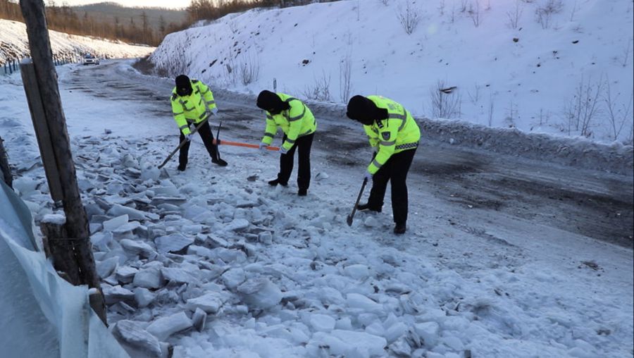 2019年12月30日,在黑龙江省大兴安岭呼中区呼阿公路53公里处,三名交警正在除冰。新华社记者孙晓宇 摄