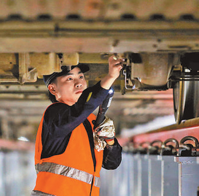 1月7日,南昌西动车所动车机械师在列车底部检修作业。朱 磊摄