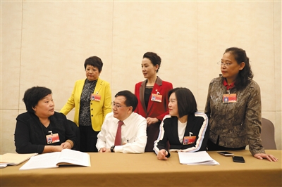 1月12日,政协工会界别委员们在小组会间歇期间,针对二孩时代如何解决职业女性的后顾之忧问题展开讨论。