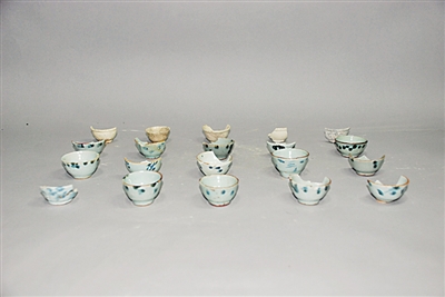 考古工作者在三个坊遗存出土遗物约600余件,瓷片约1吨。按质地分陶器、缸胎瓷、瓷器、紫砂器、玻璃器、铜器、骨器、铁器、石碑等,按器型分有酒坛、酒杯、酒瓶、酒盏、紫砂壶、麻将、牌九、烟嘴、鼻烟壶和石碑等。
