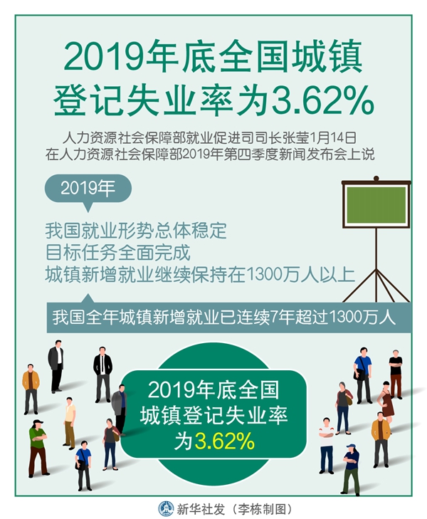 新华社北京1月14日电(记者王优玲)人力资源社会保障部就业促进司司长张莹14日说,2019年我国就业形势总体稳定,目标任务全面完成,城镇新增就业继续保持在1300万人以上,2019年底全国城镇登记失业率为3.62%。