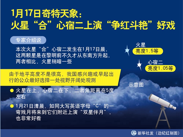 “由于地平高度不是很高,我国感兴趣或早起出行的公众最好选择一处视野开阔处观测,两颗泛着红光的星星还是比较醒目的,火星在上,心宿二在下,二者角距离在5度左右。值得一提的是,1月21日清晨,如同大写英语字母‘C’的一弯残月将来到它们附近上演‘双星伴月’,也非常好看。”赵之珩提醒说。