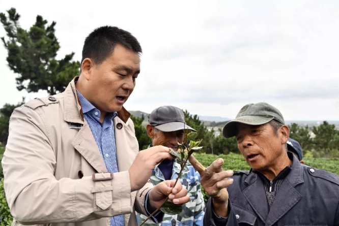 科技特派员(左)在茶园里指导茶农茶树越冬管理技术 郭绪雷 摄