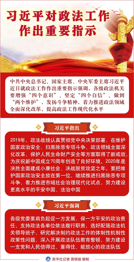 习近平指出,2019年,政法战线认真贯彻党中央决策部署,在维护国家政治安全、扫黑除恶专项斗争、政法领域全面深化改革、保护人民生命财产安全等方面取得了新成效,为庆祝新中国成立70周年创造了良好环境。2020年是决胜全面建成小康社会、决战脱贫攻坚之年。要把维护国家政治安全放在第一位,继续推进扫黑除恶专项斗争,着力推进市域社会治理现代化试点,努力建设更高水平的平安中国、法治中国。