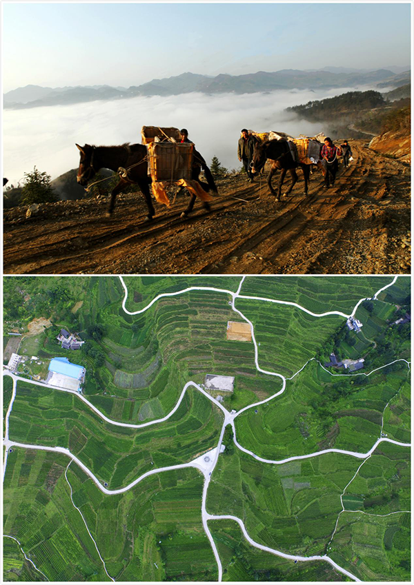 上图:刘家伦泥泞山间马帮;下图:现县、乡、村、组四级路结合产业路道路四通八达。(石阡县委宣传部供图)