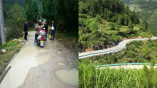 左图:石牛寨经新山至笔架山公路位于石阡县白沙镇铁矿山村,图为该公路项目实施前;右图:该公路项目起于石榴寨途径三个村民组,止于铁矿山村,涉及群众67户238人口,设计里程为5.94公里,于2018年9月30日完工,图为项目实施后。(石阡县委宣传部供图)
