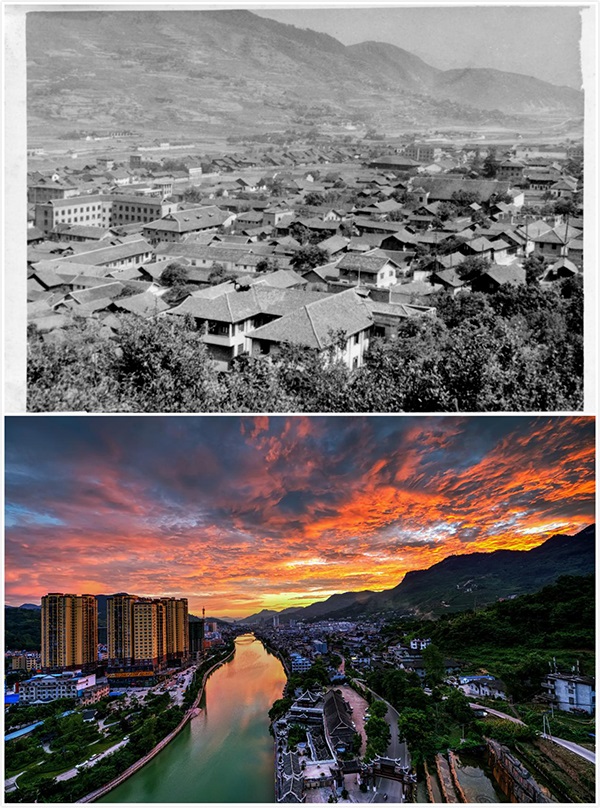 上图:石阡县城旧貌;下图:现石阡县城夜景。(石阡县委宣传部供图)