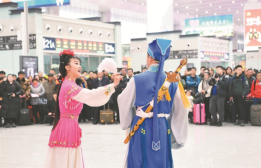 1月10日,在合肥南站候车大厅,安徽演艺集团和省文联组织的文艺小分队为南来北往的乘客送上“文化年货”。