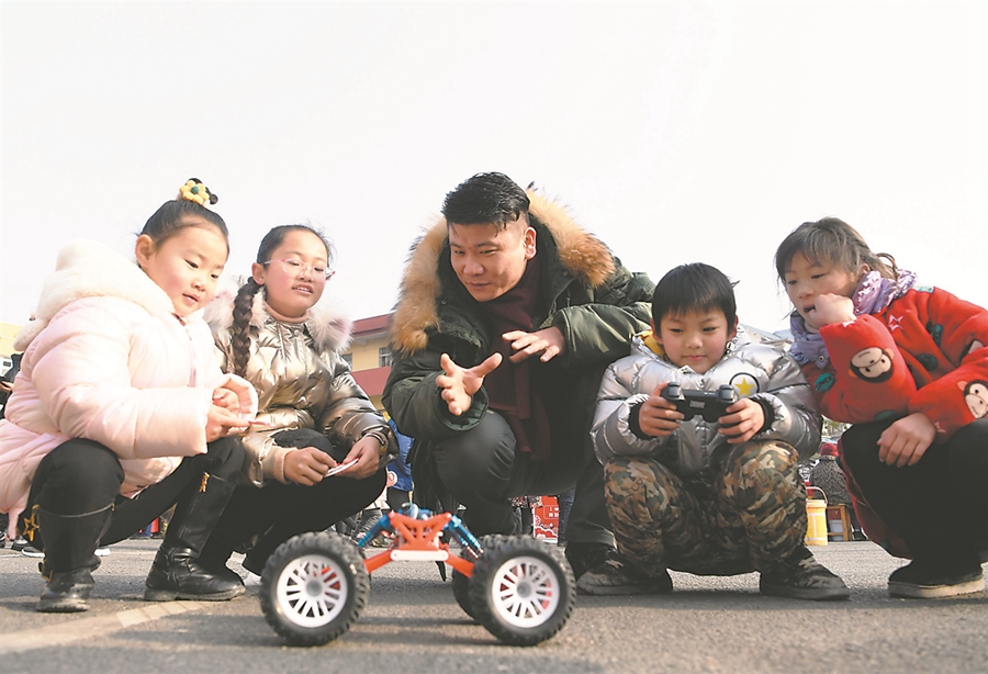 1月19日,团省委、省青联在凤台县凤凰镇芮集村开展安徽青年“三下乡”活动,省青联委员现场开设“青科讲堂”,并向孩子们展示智能机甲坦克等创意科技作品。