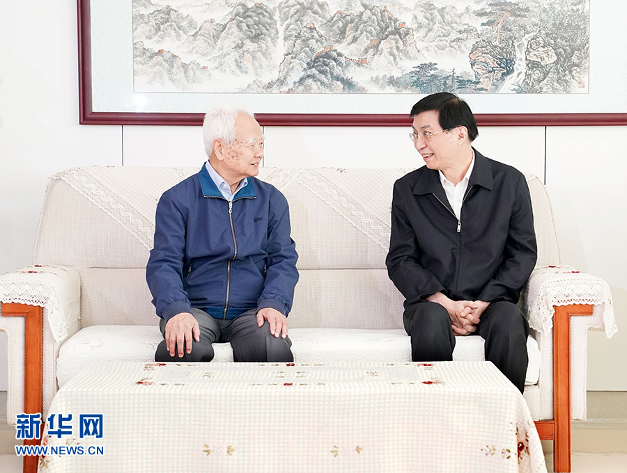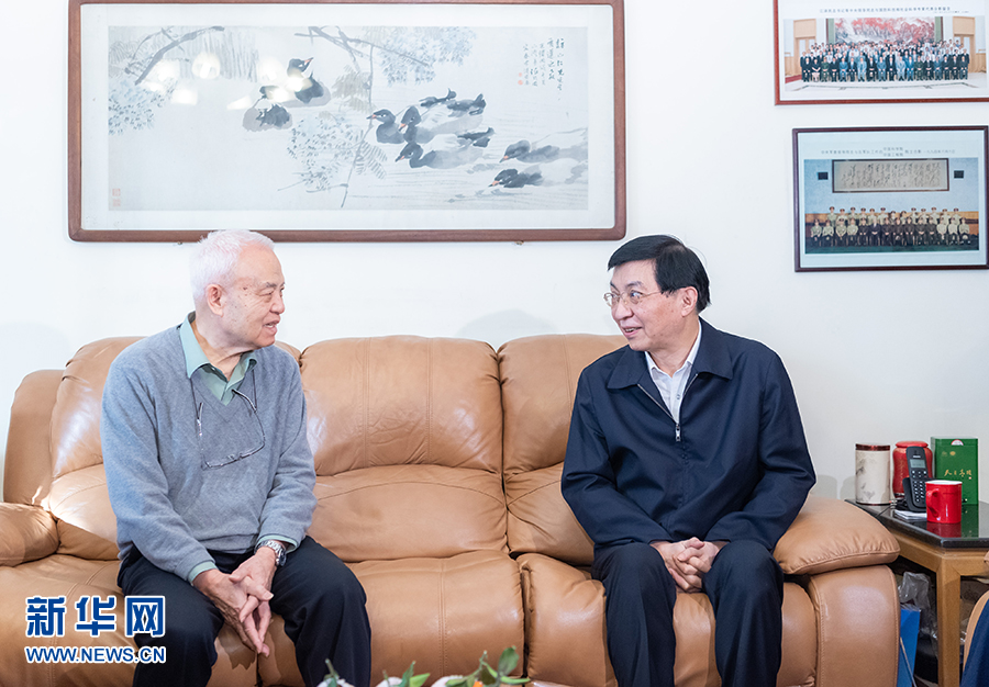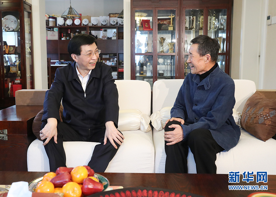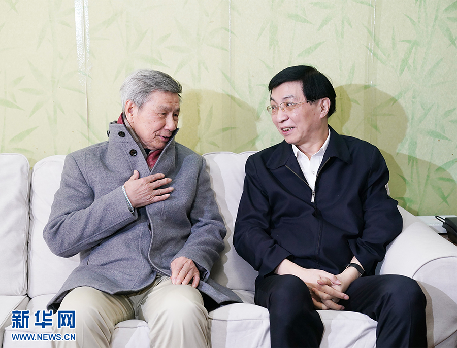 1月22日,中共中央政治局常委、中央书记处书记王沪宁代表习近平总书记和党中央看望文化教育界知名人士和科技专家,向他们致以诚挚问候,向广大文化教育工作者和科技工作者致以新春祝福。这是王沪宁看望中国科学院院士、大气物理专家曾庆存。 新华社记者 刘彬 摄