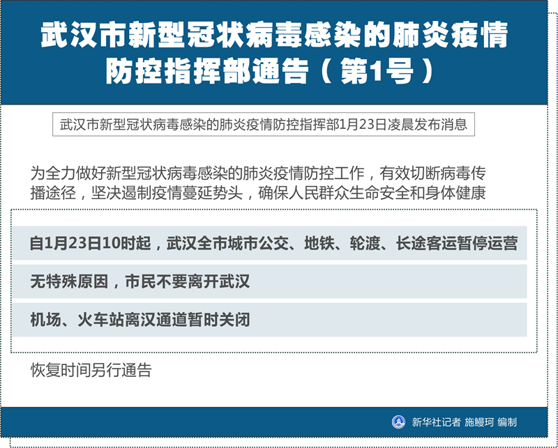 武汉市新型冠状病毒感染的肺炎疫情防控指挥部通告(第1号)-新华网