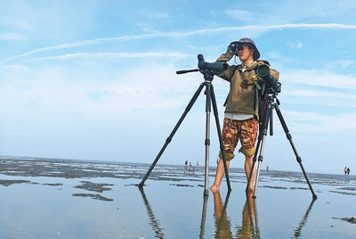 湛江红树林国家级自然保护区处于国际候鸟迁徙的重要通道,是候鸟迁徙的中转站或者越冬地。何韬是一名“90后”小伙子。每逢休息日,何韬经常骑着小摩托,驮上设备,到几十公里外的滩涂边观鸟。当潮水逐渐退去,宽阔的滩涂露出,原本藏在树林里的水鸟,一拨拨出来觅食。他选好观测点,架起设备,全身心投入,一待就是一整天。