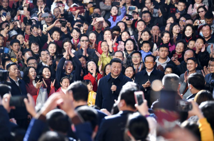 结束对昆明国际会展中心的考察后,习近平在人群的包围中,向全国人民拜年。