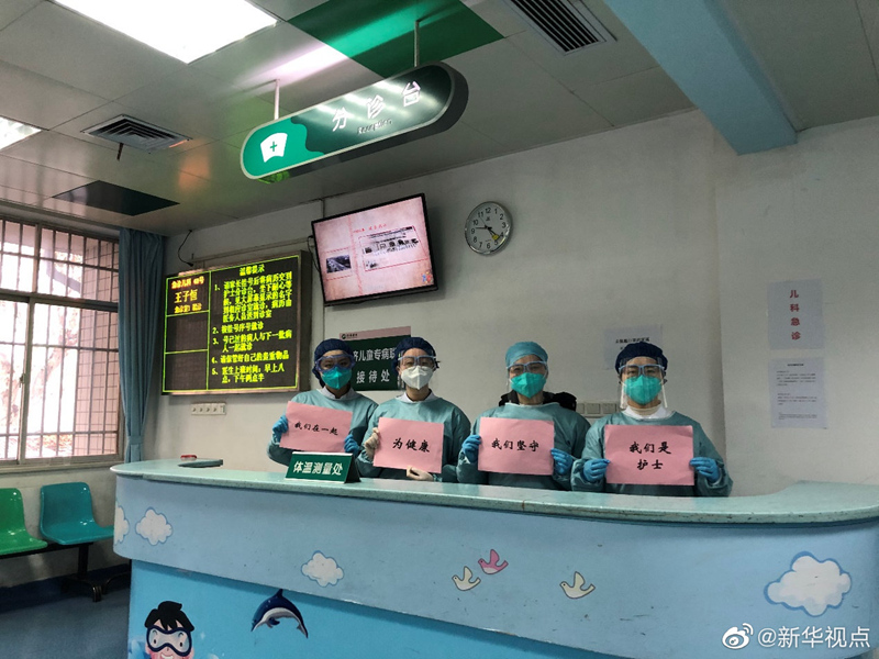 “不畏惧、不退缩”“我们坚守” “亲人们,勿念。”除夕,武汉同济医院儿科医护人员在交班间隙拍了几张特别的拜年照片发给家人和同事,为武汉市的医务人员加油,也让家人放心。除夕,本应是阖家团圆的时刻,但因为突如其来的疫情,许多医务人员必须坚守在临床第一线。为了让父母放心,让丈夫安心,也为了给全市坚守在最前线的医护同行加油鼓劲,今天交班时,她们拍下了这样一组照片。(记者李劲峰、胡喆)