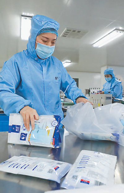 近日,各地口罩生产企业抓紧生产,全力增加市场供应。图为浙江省德清县一家口罩企业生产车间,工作人员在包装口罩。王正 王珏摄影报道(影像中国)