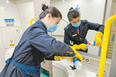 为应对疫情,铁路部门全力做好相关防控工作。图为南昌开往南京的G1496次列车上,南昌客运段工作人员认真做好车厢清洁、消毒工作。鲍赣生摄(人民视觉)