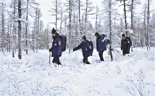 1月24日,内蒙古阿龙山森林公安局“90后”女森林警察李慧与同事在大兴安岭原始林区踏雪巡逻。当日最低气温降至-46℃,极低的气温使民警们的围巾、帽子结满冰霜。她们守护着大兴安岭腹地森林,每天驱车近百公里,徒步30余公里,保护着辖区内的野生动植物资源,维护着林区社会治安秩序。 王 伟摄(中经视觉)