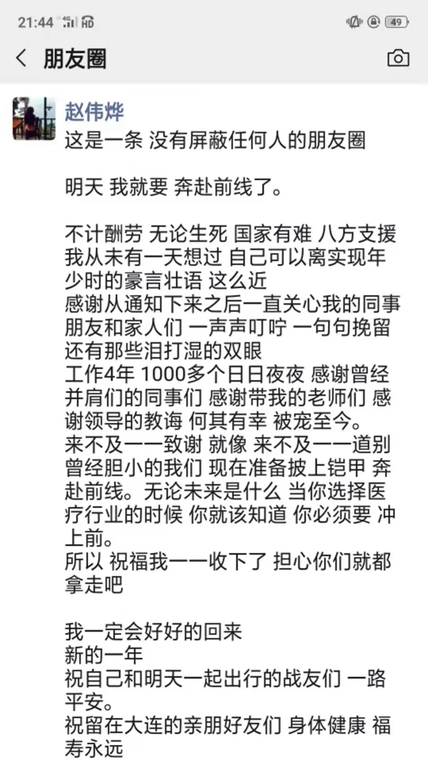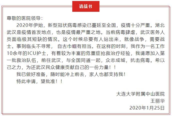 通知下发后,大连各大医院医护人员纷纷主动请缨:“只要被需要,义无反顾,放心吧主任,我强壮”“主任,我也可以去武汉,等待您的派遣”“一切听从组织安排”“需要我们的时候到了,没有硝烟的战场需要我们,我自愿加入抗击疫情的队伍”……医院微信群里被自愿报名声刷屏。