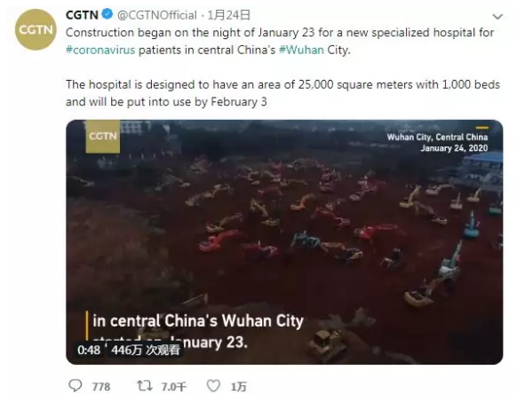 昨晚,CGTN在推特发布的一条关于武汉火神山医院工地施工现场的视频一举冲上该平台国际新闻首页热门,观看量超446万,超过153万的全球网友参与互动。