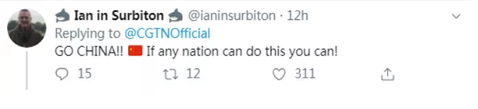 “如果有任何一个国家可以做到,那就是你们了!中国加油啊!”